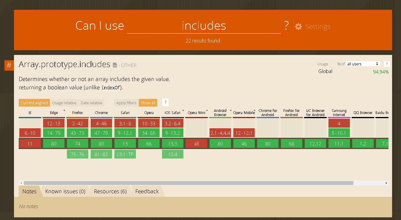 또한 구글링 외에도, MDN이나 Can I use에서 확인을 원하는 함수를 키워드로 검색해보면 한 눈에 각 브라우저 버전별 호환성을 확인할 수 있습니다.